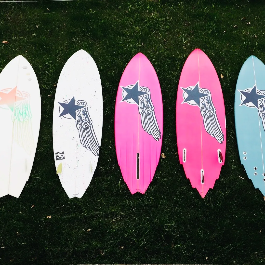 おもむろにビーチへ抱えていたボードを並べ、ボトムに大きな星と羽、デッキには旧車のエンブレムの様な「Deluxe surfboard」 のロゴが入ったボードだった。